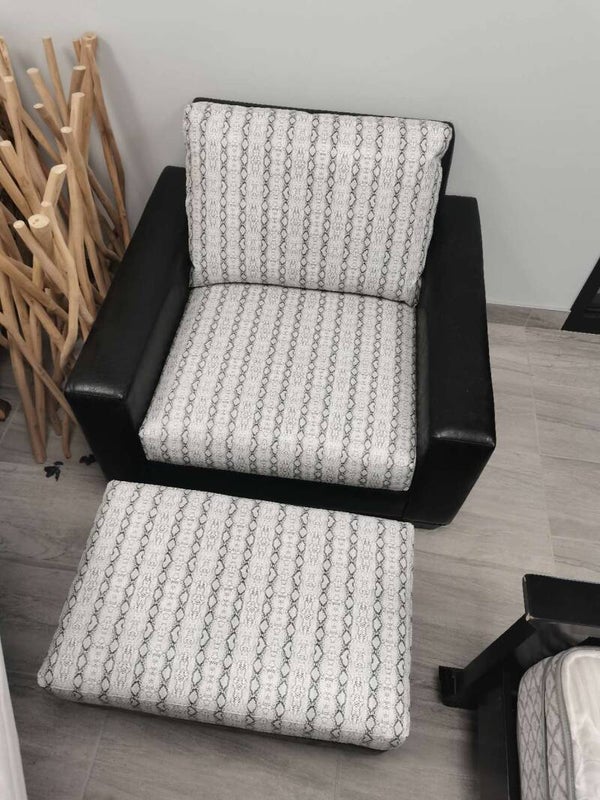 Arms and the chair frame are in black, seat and back cushion with white patterns.